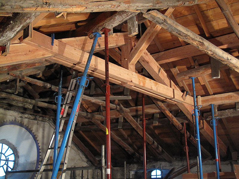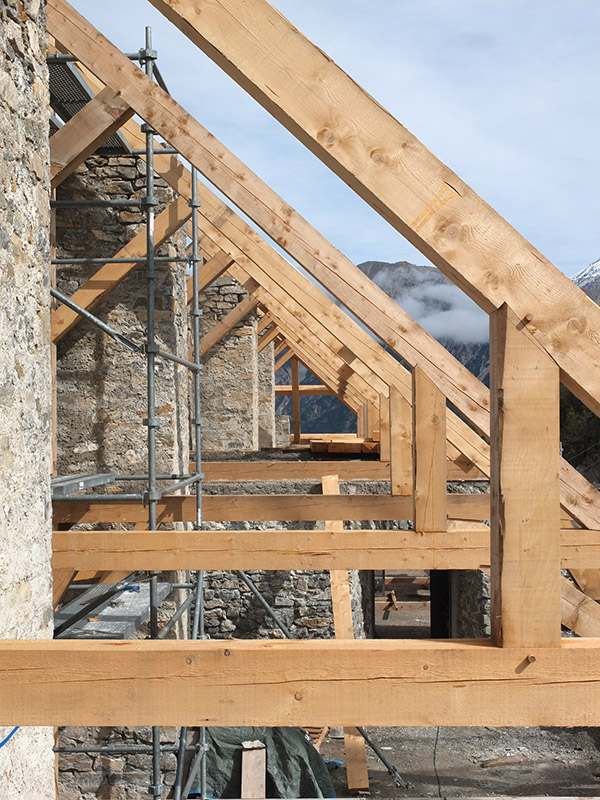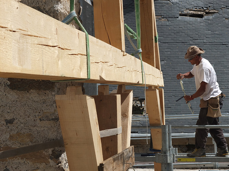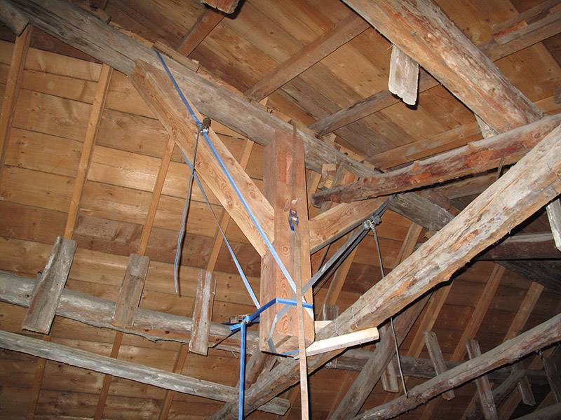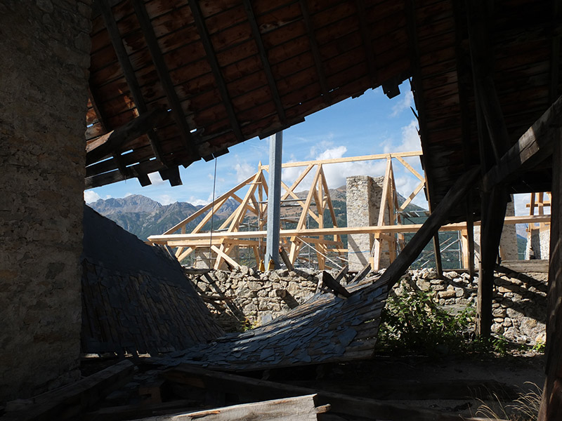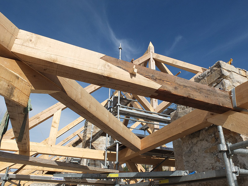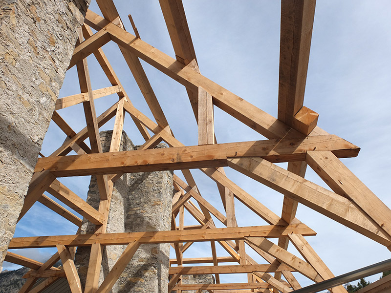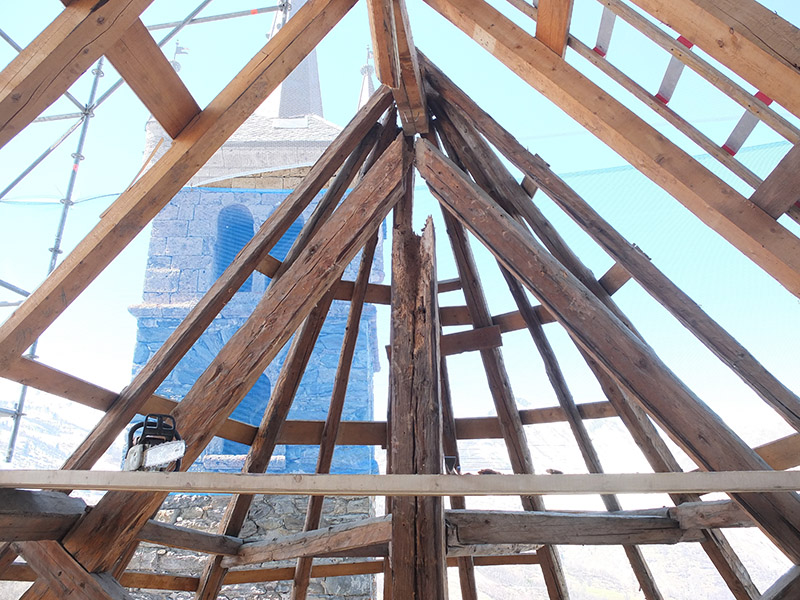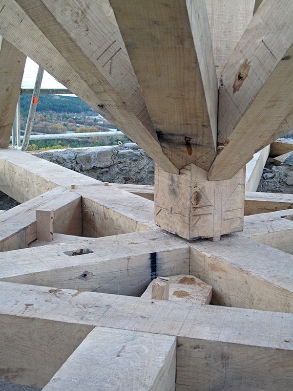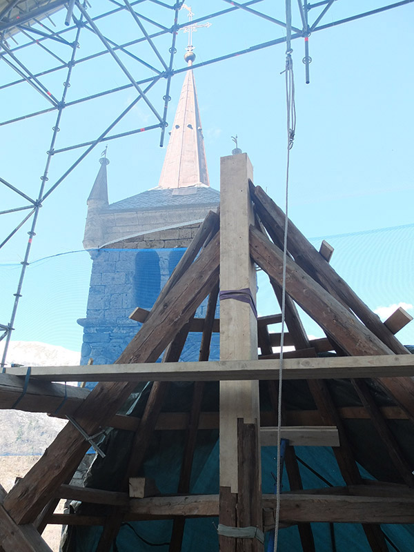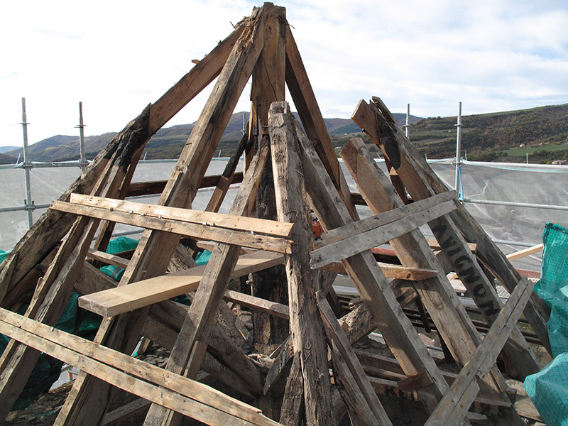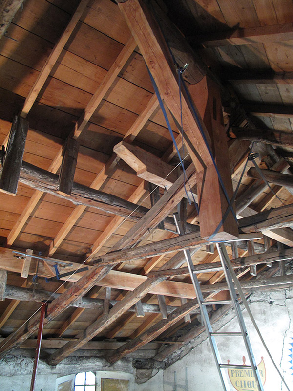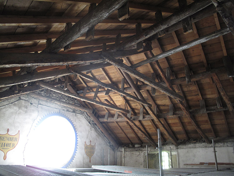 Chapelle des pénitents, la Grave. La charpente après dépose des tableaux et du lambris. On remarque la flèche très importante des pannes. Chapelle des pénitents, la Grave. Taille d'un poinçon. Chapelle des pénitents, la Grave. Poinçon. Chapelle des pénitents, la Grave. Mise en place de la première ferme en sous-oeuvre. Chapelle des pénitents, la Grave. Pose des pannes en sous-oeuvre. Chapelle des pénitents, la Grave. Mise en place de la première ferme en sous-oeuvre. Chapelle des pénitents, la Grave. Entraits assemblés par double moisement. Chapelle des pénitents, la Grave.  Mise en place de la première ferme en sous-oeuvre. Chapelle des pénitents, la Grave. La nouvelle charpente terminée.