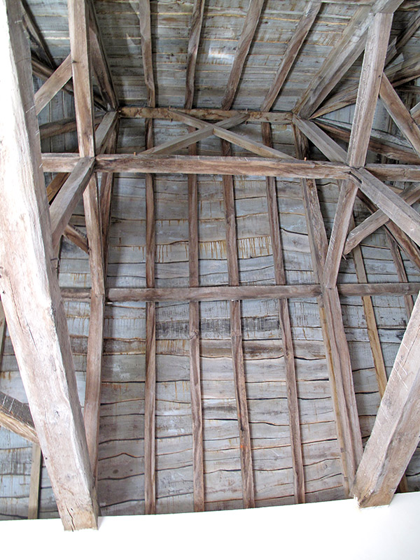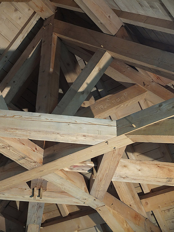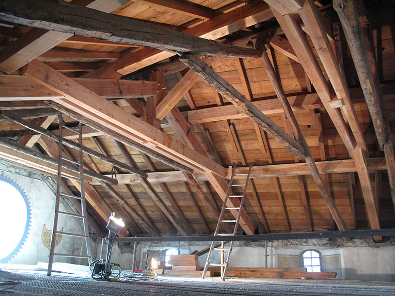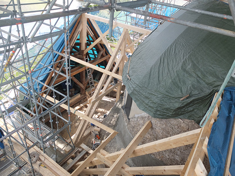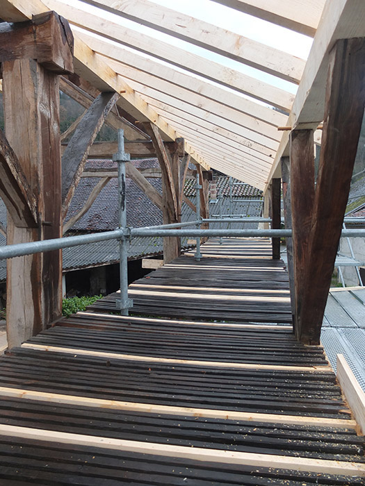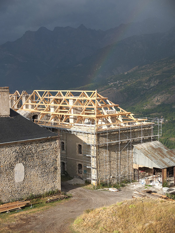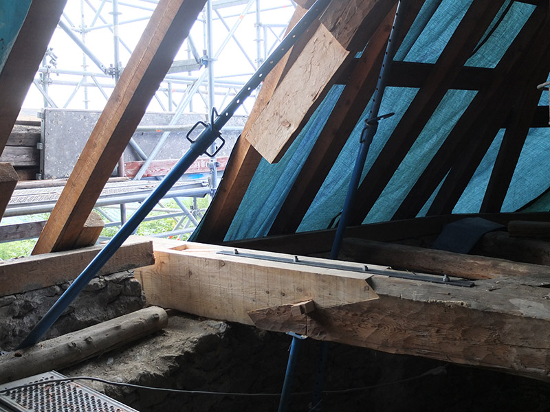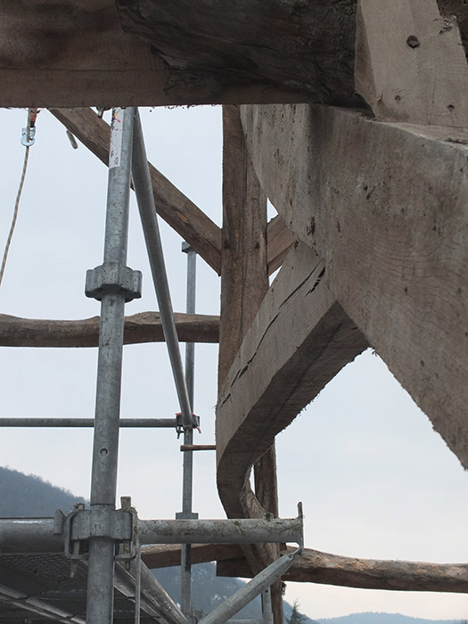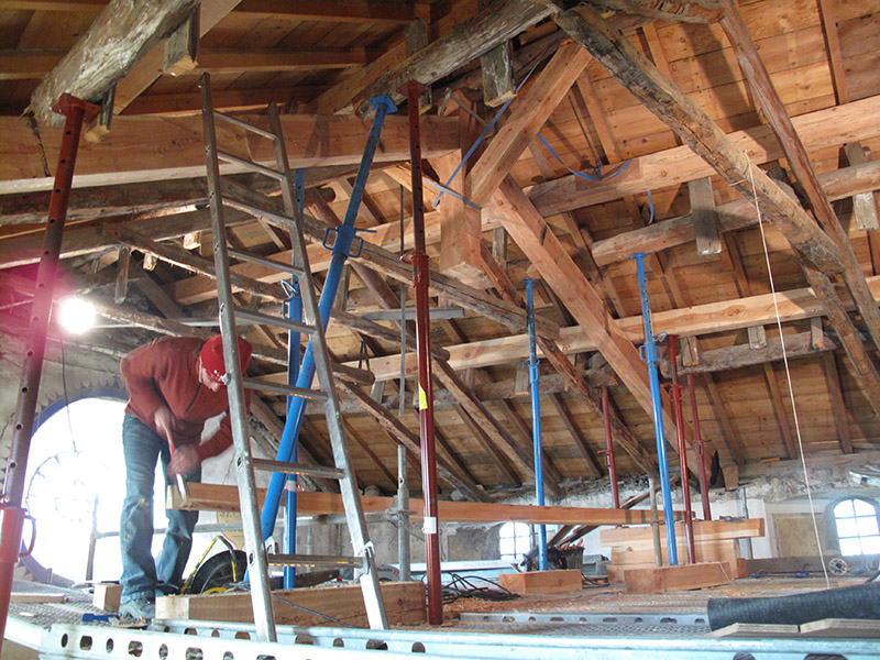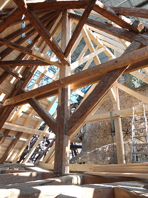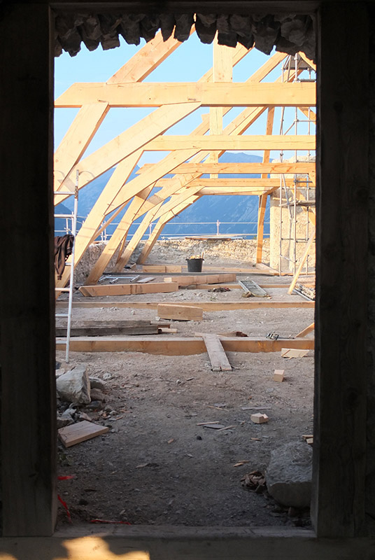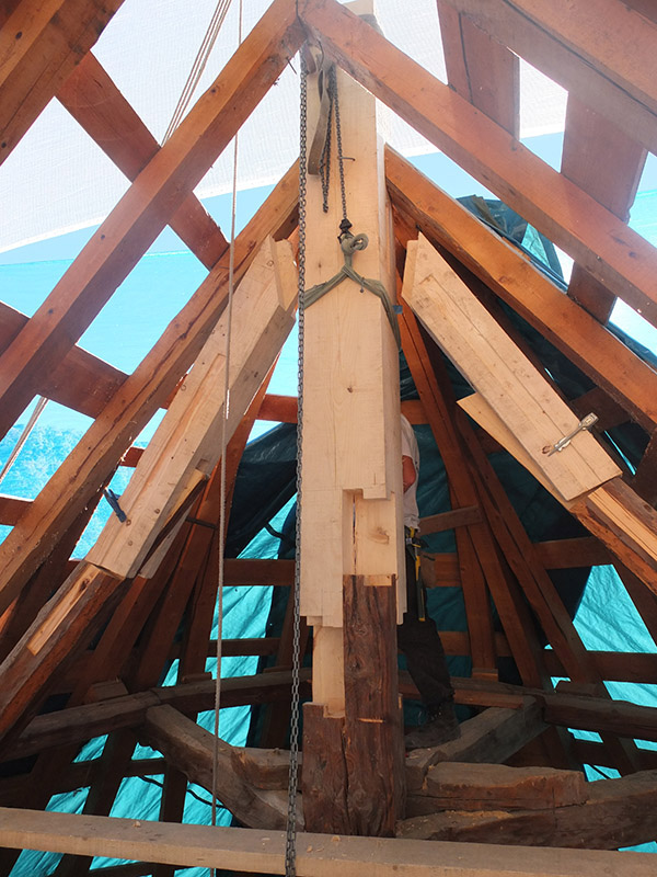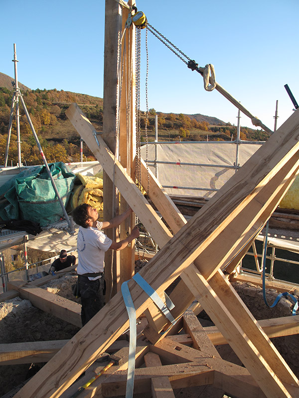 Chapelle des pénitents, la Grave. La charpente après dépose des tableaux et du lambris. On remarque la flèche très importante des pannes. Chapelle des pénitents, la Grave. Taille d'un poinçon. Chapelle des pénitents, la Grave. Poinçon. Chapelle des pénitents, la Grave. Mise en place de la première ferme en sous-oeuvre. Chapelle des pénitents, la Grave. Pose des pannes en sous-oeuvre. Chapelle des pénitents, la Grave. Mise en place de la première ferme en sous-oeuvre. Chapelle des pénitents, la Grave. Entraits assemblés par double moisement. Chapelle des pénitents, la Grave.  Mise en place de la première ferme en sous-oeuvre. Chapelle des pénitents, la Grave. La nouvelle charpente terminée.