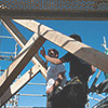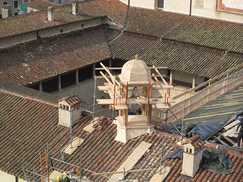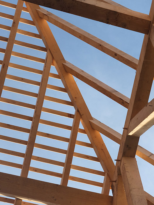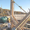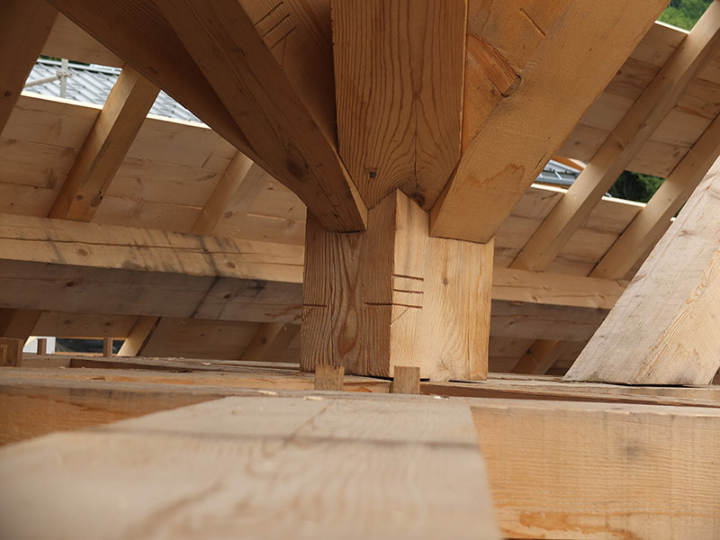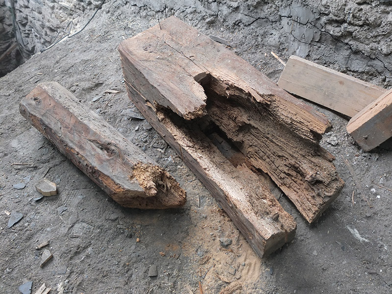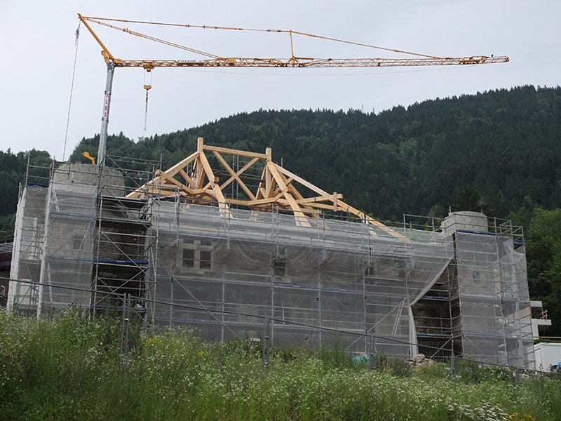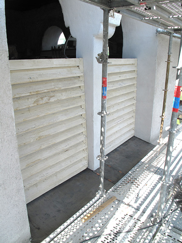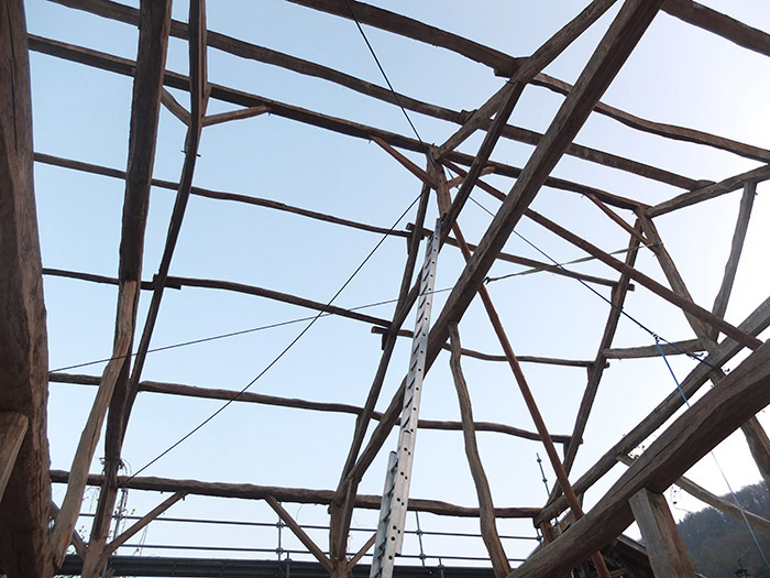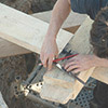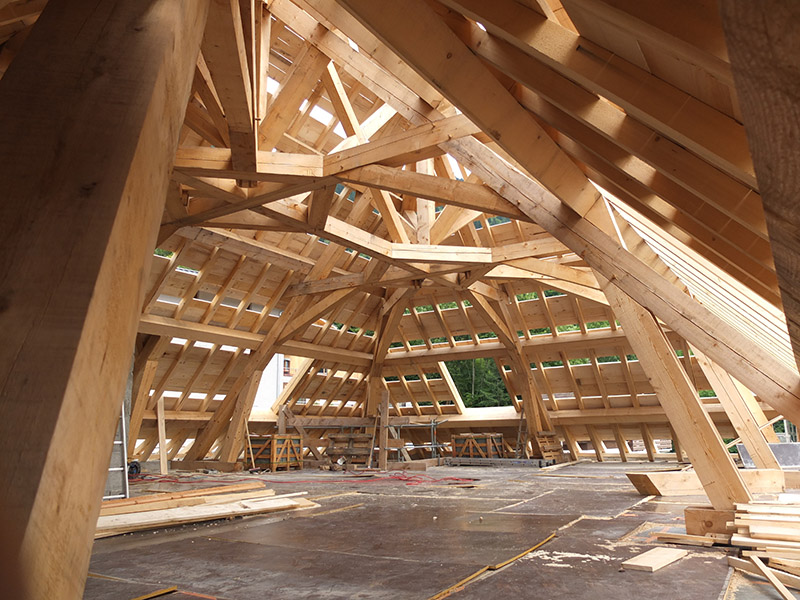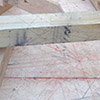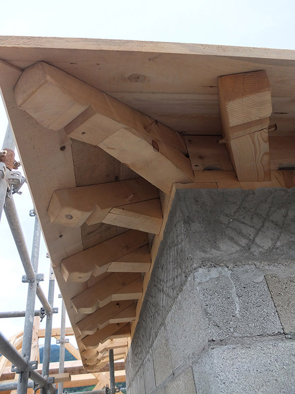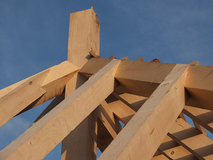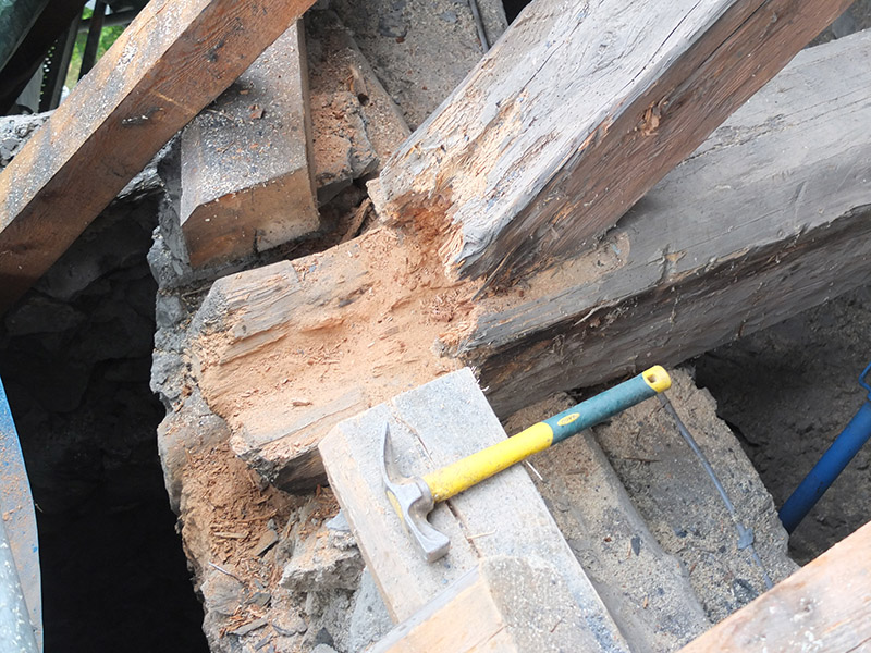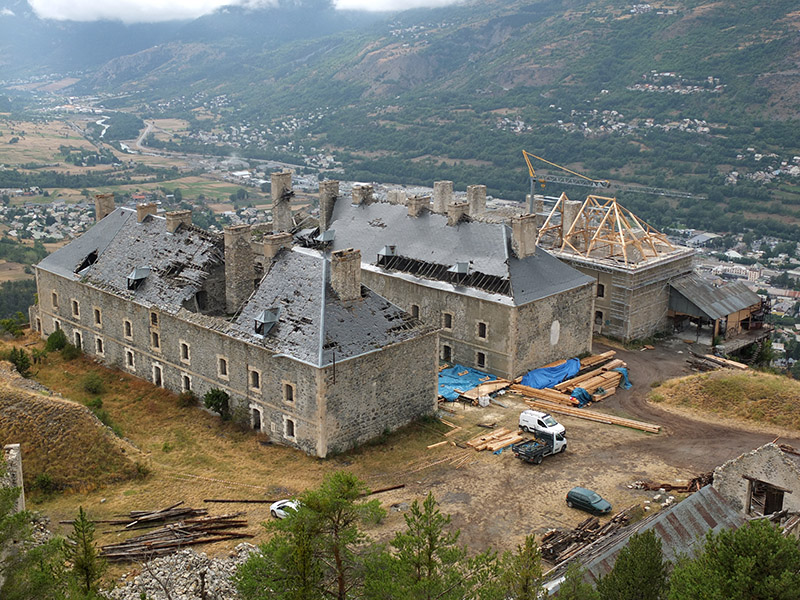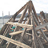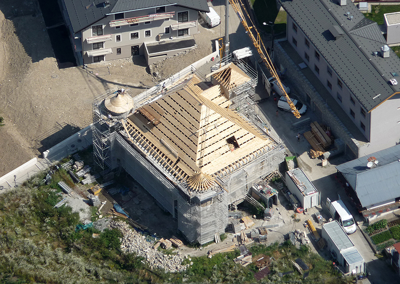 Chapelle des pénitents, la Grave. La charpente après dépose des tableaux et du lambris. On remarque la flèche très importante des pannes. Chapelle des pénitents, la Grave. Taille d'un poinçon. Chapelle des pénitents, la Grave. Poinçon. Chapelle des pénitents, la Grave. Mise en place de la première ferme en sous-oeuvre. Chapelle des pénitents, la Grave. Pose des pannes en sous-oeuvre. Chapelle des pénitents, la Grave. Mise en place de la première ferme en sous-oeuvre. Chapelle des pénitents, la Grave. Entraits assemblés par double moisement. Chapelle des pénitents, la Grave.  Mise en place de la première ferme en sous-oeuvre. Chapelle des pénitents, la Grave. La nouvelle charpente terminée.