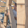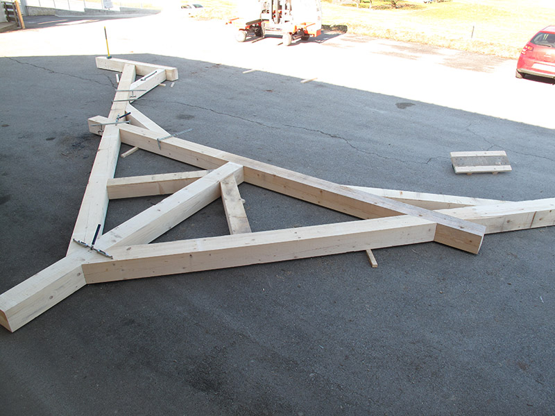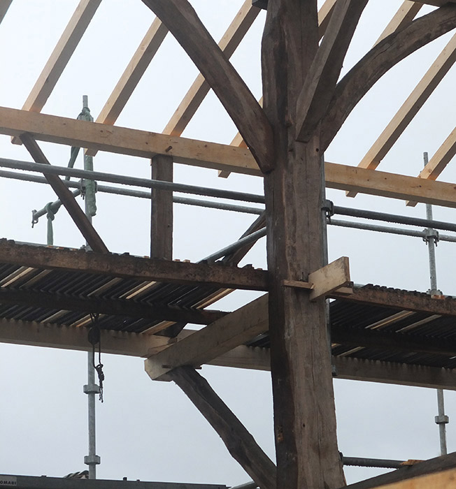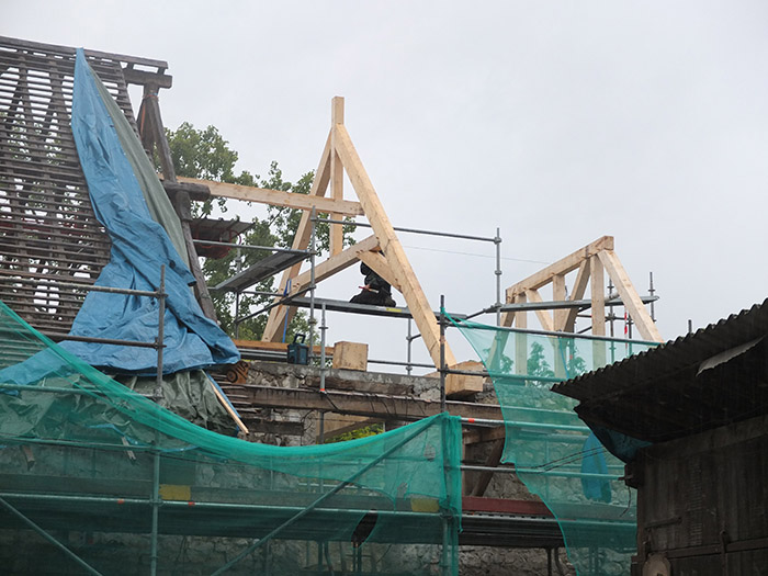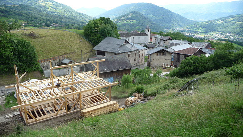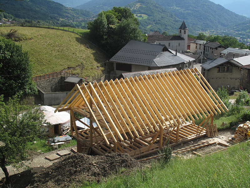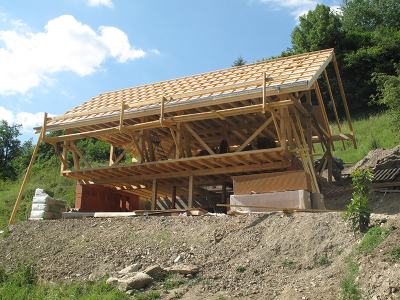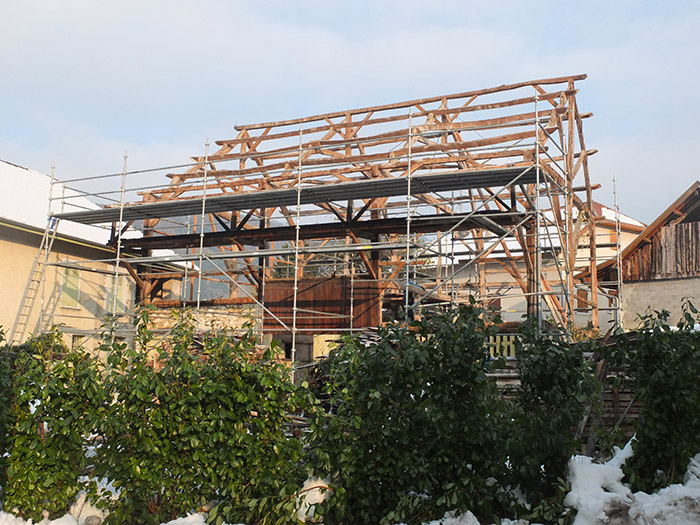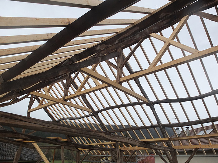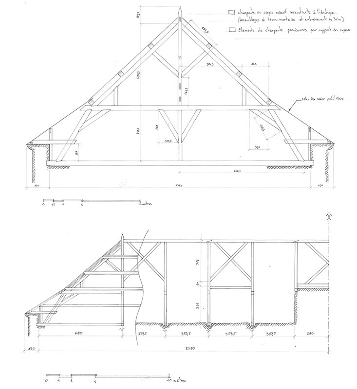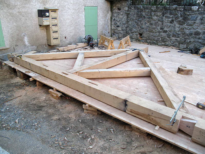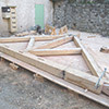Cognin, château de Villeneuve, reconstruction de la croupe de la grange. Cognin, château de Villeneuve, reconstruction de la croupe de la grange. Cognin, château de Villeneuve, reconstruction de la croupe de la grange. Cognin, château de Villeneuve, reconstruction de la croupe de la grange. Saint Aupre. Grange et son séchoir à noix avant restauration. Saint Aupre. Déversement des fermes et de la couverture sur 80 centimètres. Saint Aupre. Redressement de la charpente au tire fort. Saint Aupre. Saint Aupre. C'est la flèche des entraits retroussés, placés dans le même sens, qui a provoqué le déversement de la charpente. Saint Aupre. Le séchoir à noix. Saint Aupre. La charpente après restauration. Saint Aupre. Redressement du séchoir à noix. Console à tenon traversant.