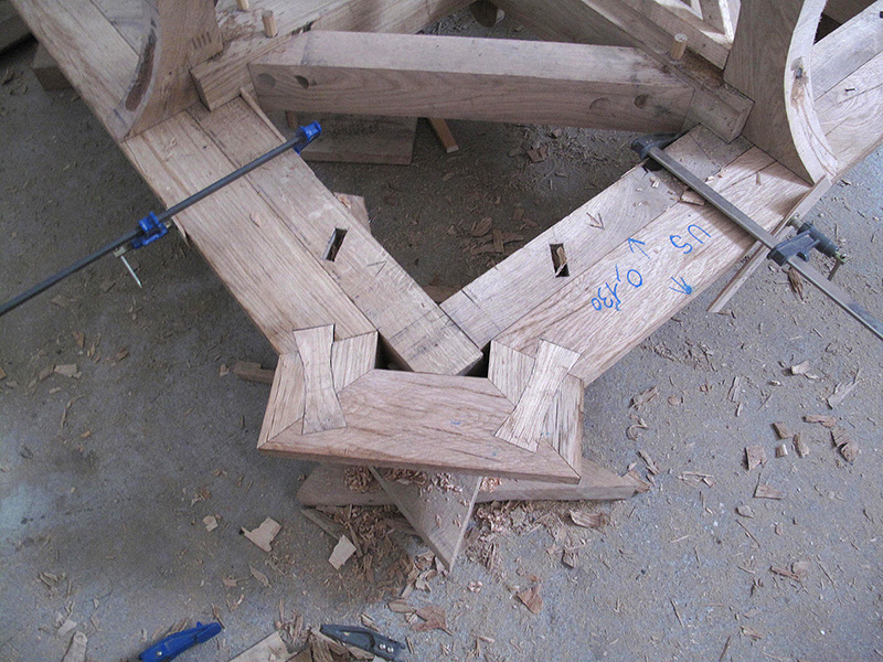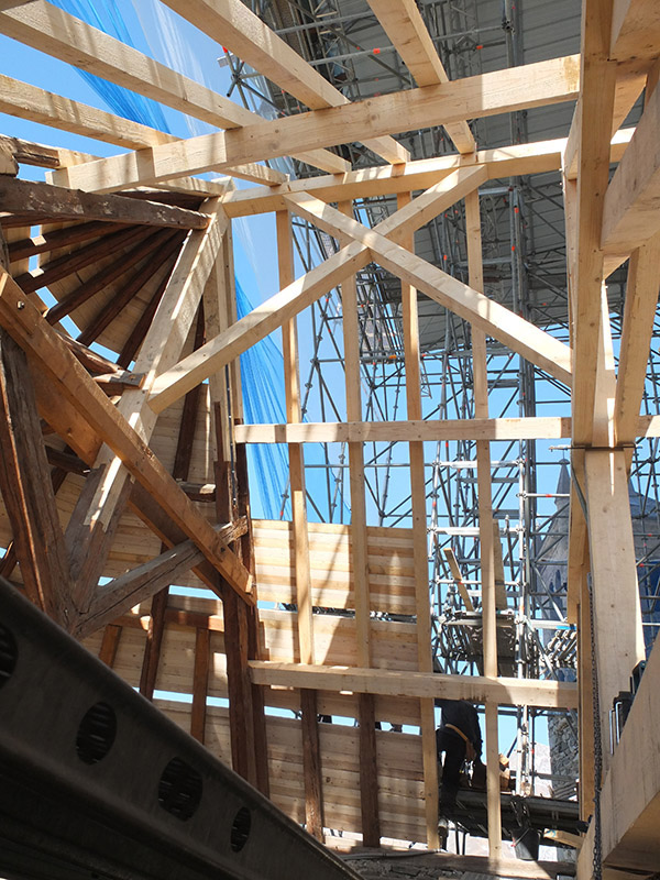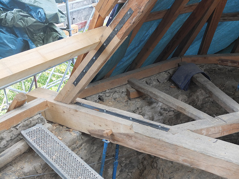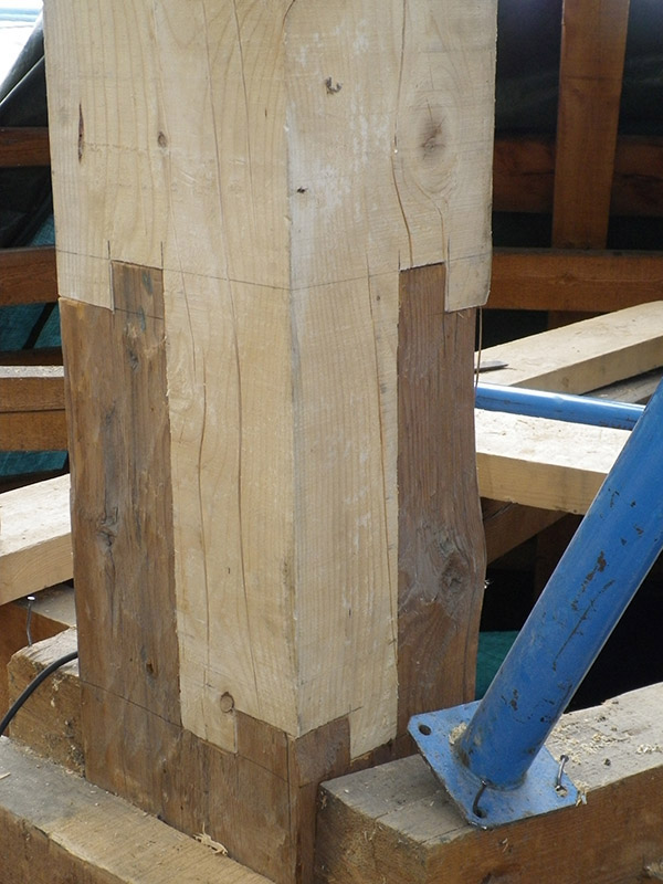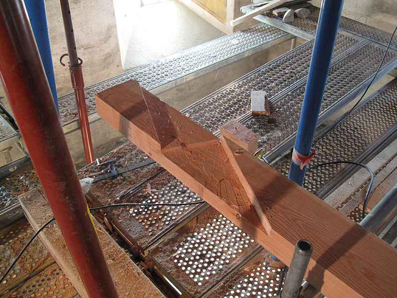 Notre Dame de la Vie. Chapelle sud après réparation. Notre Dame de la Vie. Chapelle sud après réparation. Notre Dame de la Vie. Poinçon de la chapelle ouest avant réstauration. Notre Dame de la Vie. Greffe du Poinçon. Notre Dame de la Vie. Pied de ferme de l'abside ouest avant restauration. Notre Dame de la Vie. Réparation du pied de ferme de l'abside ouest. Enture en trait de jupiter avec tenon sur l'entrait, renforcé par des fers en U. Notre Dame de la Vie. Réparation du pied de ferme de l'abside ouest. Enture en trait de jupiter avec tenon sur l'entrait, renforcé par des fers en U. Notre Dame de la Vie. Ancien poinçon de l'abside est. Notre Dame de la Vie. Abside est. Nouvelles têtes du poinçon et des arbalétriers. Notre Dame de la Vie. Abside est. Mise en place des greffes. Notre Dame de la Vie. Abside est. Enture du poinçon: assemblage double à mi-bois contrariés, avec tenons. Notre Dame de la Vie. Vue d'ensemble de l'abside est après réparation.